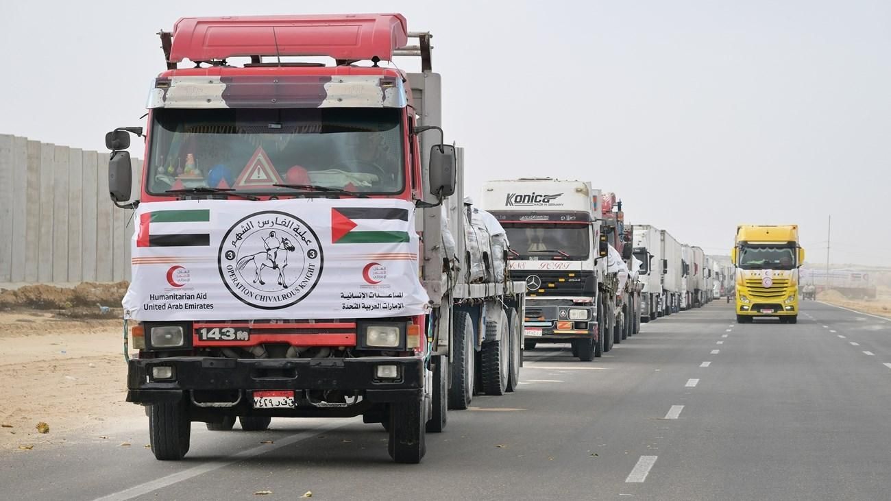 أول قافلة اغاثية إماراتية من 17 شاحنة تصل شمال غزة عبر معبر كرم بوسالم