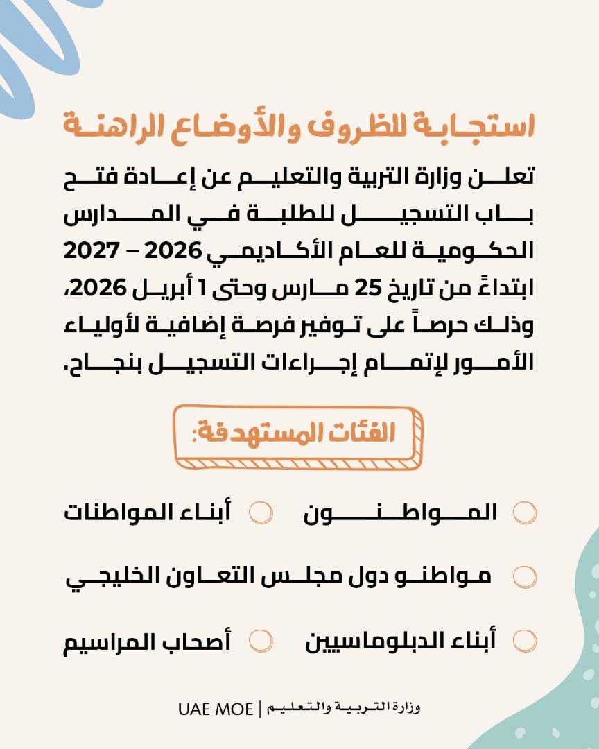 استجابة للظروف والأوضاع الراهنة .. وزارة التربية والتعليم تعلن عن إعادة فتح باب التسجيل للطلبة في المدارس الحكومية للعام الأكاديمي 2026 – 2027، اعتباراً من اليوم 25 مارس وحتى 1 أبريل 2026، لتوفير فرصة إضافية لإتمام إجراءات التسجيل بنجاح عبر الموقع الإلكتروني https://t.co/IOnrX3YqYb