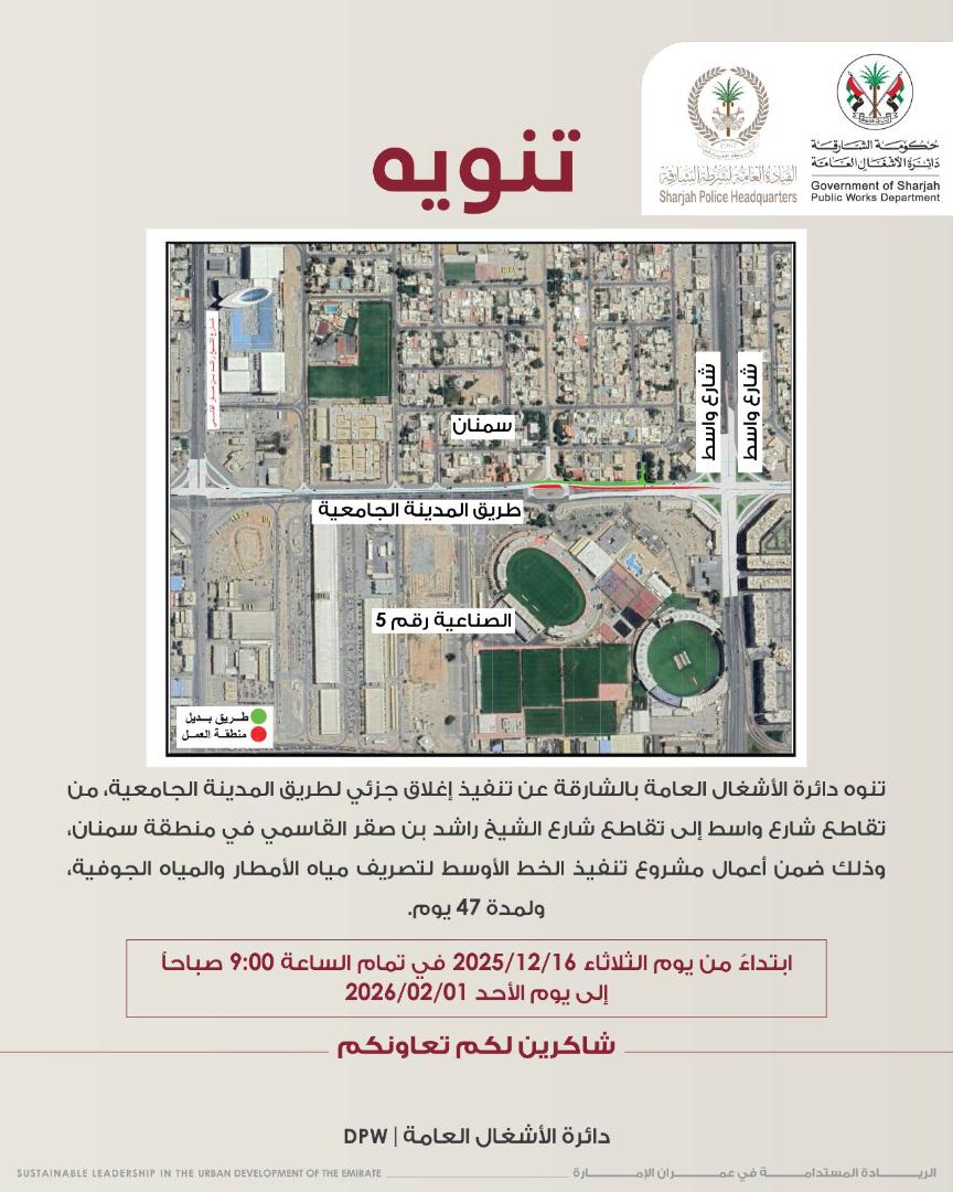 "أشغال الشارقة" تنوه بتنفيذ إغلاق جزئي لطريق المدينة الجامعية، من تقاطع شارع واسط إلى تقاطع شارع الشيخ راشد بن صقر القاسمي في منطقة سمنان، ضمن أعمال مشروع تنفيذ الخط الأوسط لتصريف مياه الأمطار والمياه الجوفيه، ولمدة 47 يوماً من الثلاثاء 16 ديسمبر الجاري، وحتى الأحد 1 فبراير 2026.