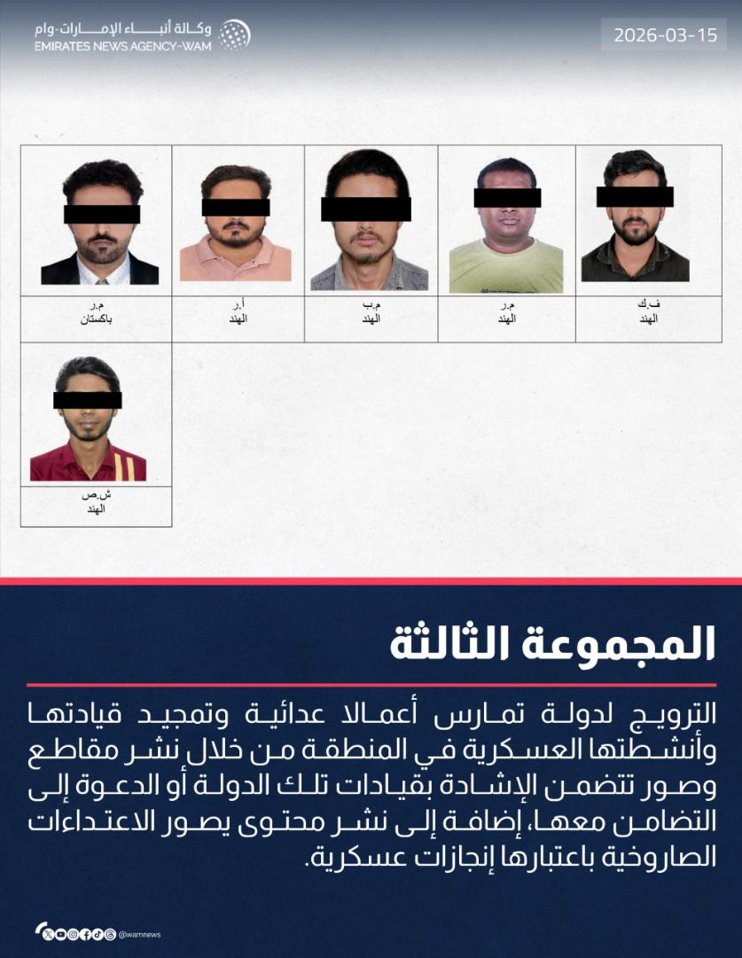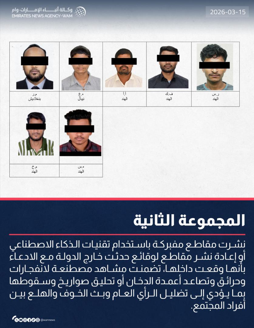 استمرارا لجهود الرصد والمتابعة لما يتم نشره أو بثه عبر المنصات الرقمية من معلومات مضللة ومحتوى مصطنع يهدف إلى إثارة البلبلة وتقويض الأمن العام والاضرار بأمن الدولة.. أمر المستشار الدكتور حمد سيف الشامسي النائب العام للدولة بالقبض على مجموعة أخرى تضم (25) شخصا من جنسيات مختلفة وإحالتهم الى محاكمة عاجلة، بعد ثبوت تورطهم في نشر وتداول محتوى رقمي عبر عدد من المنصات الرقمية من شأنه تضليل الرأي العام والإضرار بالأمن والاستقرار.
