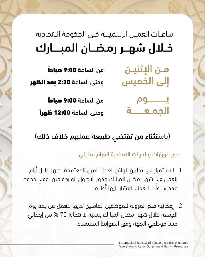 الهيئة الاتحادية للموارد البشرية الحكومية تعلن ساعات العمل الرسمية في الحكومة الاتحادية خلال شهر رمضان المبارك.