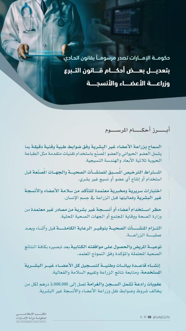 حكومة الإمارات تصدر مرسوماً بقانون اتحادي بتعديل بعض أحكام قانون التبرع وزراعة الأعضاء والأنسجة