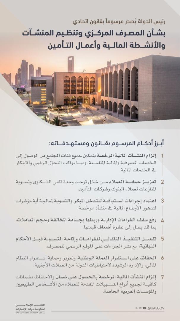 رئيس الدولة يصدر مرسوماً بقانون اتحادي بشأن المصرف المركزي وتنظيم المنشآت والأنشطة المالية وأعمال التأمين