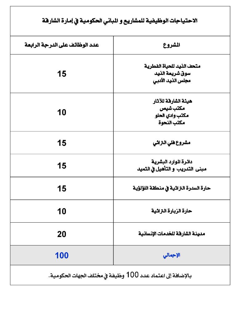 اعتماد 100 وظيفة لاحتياجات المشاريع والمباني الحكومة في إمارة الشارقة
