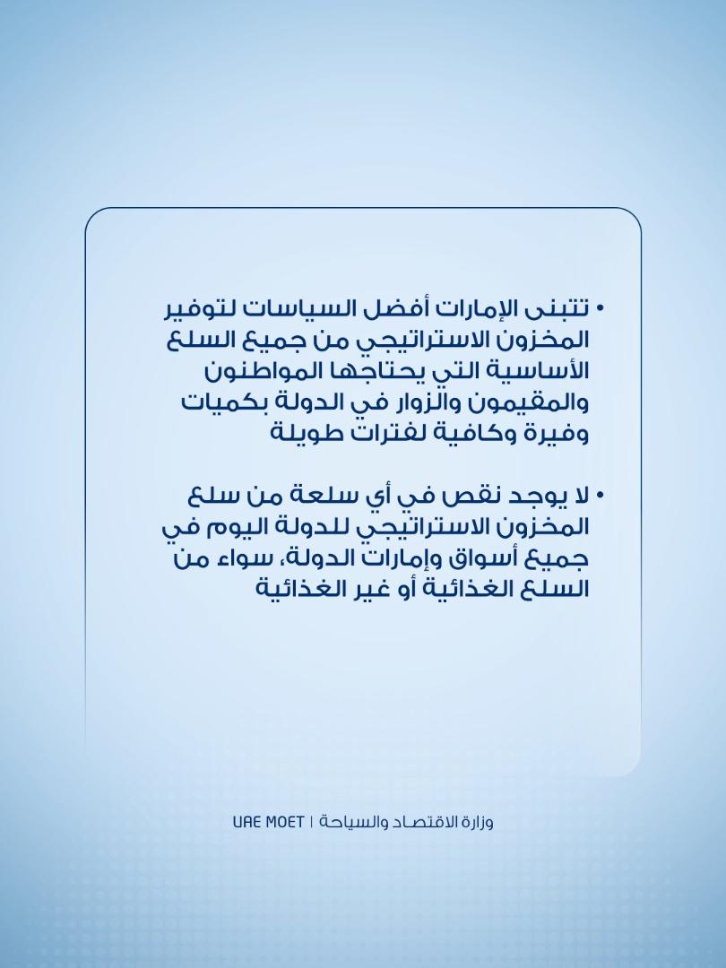 في ظلّ ما تشهده المنطقة حالياً من اضطرابات جيوسياسية، تؤكد وزارة الاقتصاد والسياحة أن السلع الغذائية الأساسية في الدولة متوفرة بكميات كافية في الأسواق