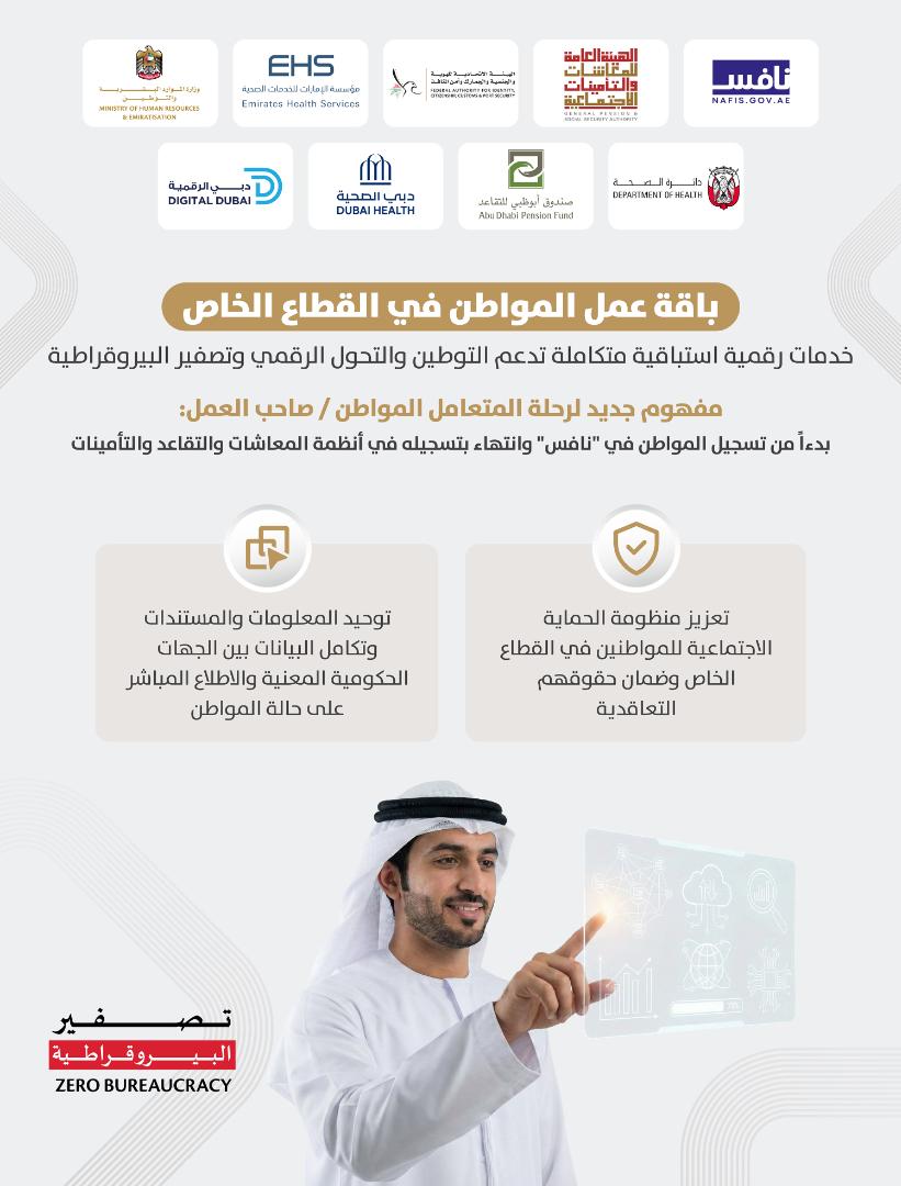 وتستهدف الباقة توحيد المعلومات والمستندات المطلوبة بين الجهات المنظمة وضمان تسجيل كافة المواطنين العاملين في القطاع الخاص في أنظمة المعاشات والتقاعد والتأمينات في الدولة وتعزيز تكامل الأنظمة الرقمية لتقديم خدمات سريعة وفعالة.