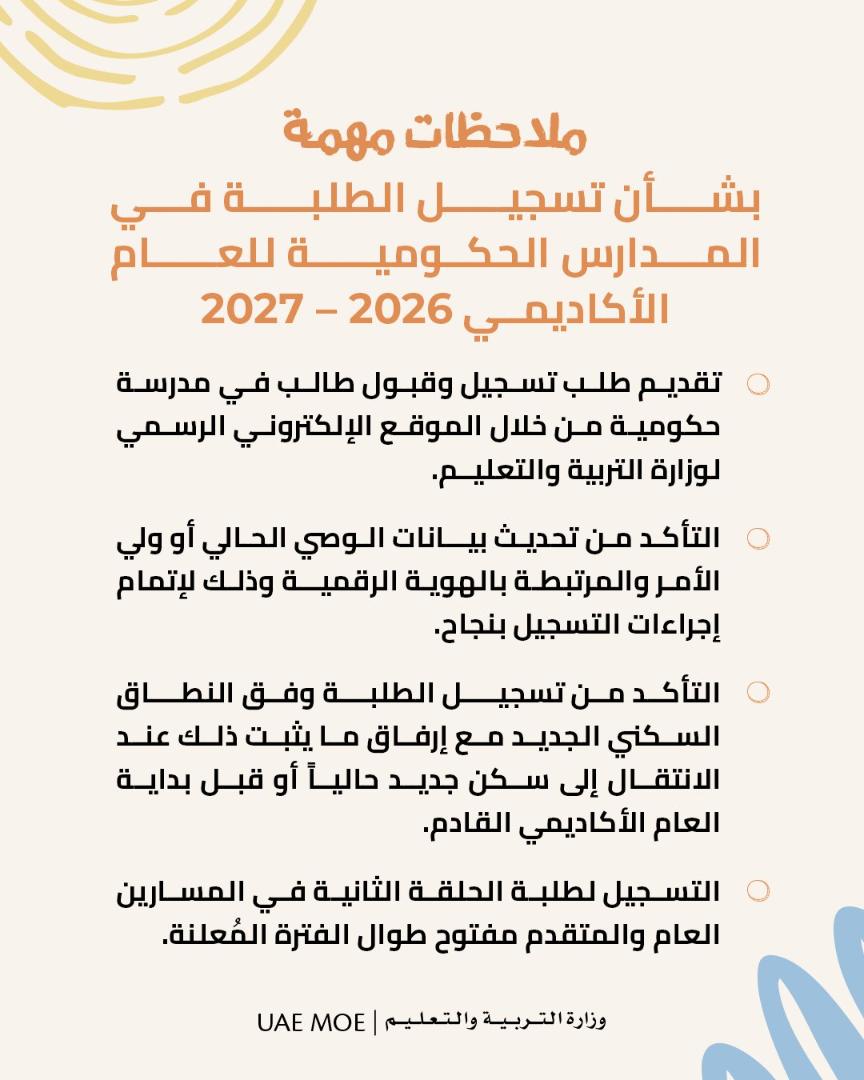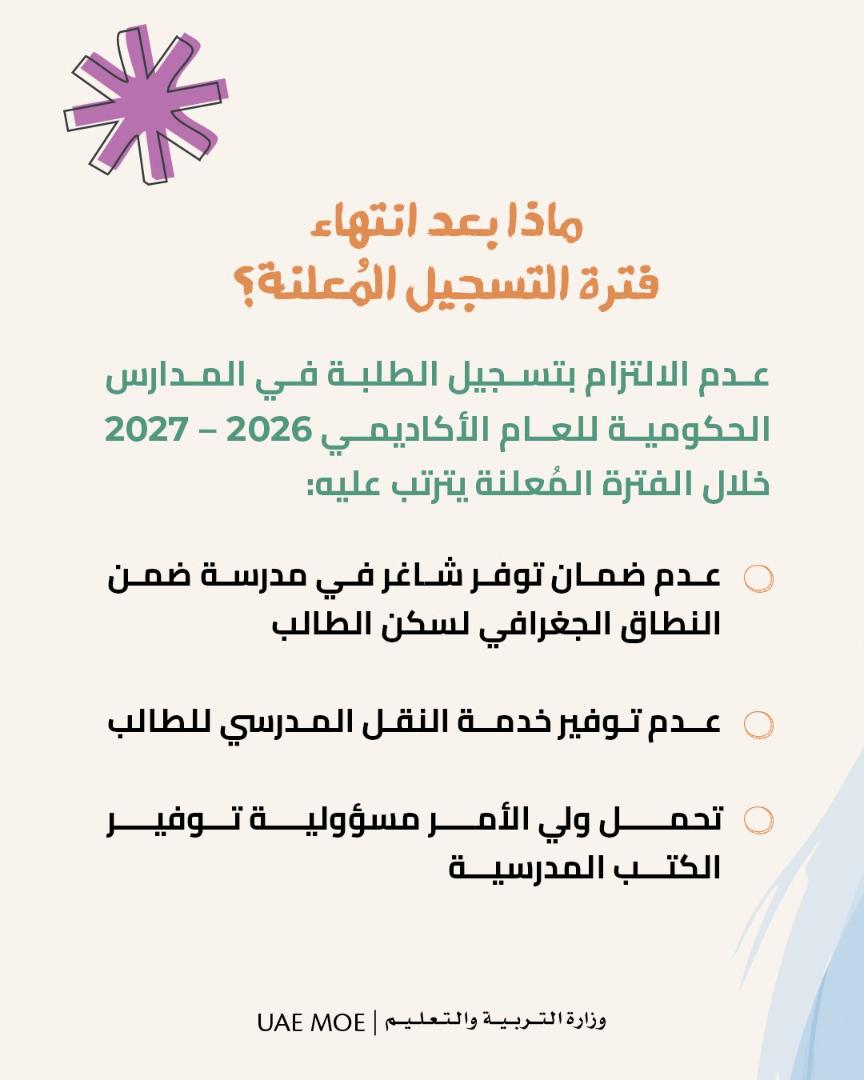 استجابة للظروف والأوضاع الراهنة .. وزارة التربية والتعليم تعلن عن إعادة فتح باب التسجيل للطلبة في المدارس الحكومية للعام الأكاديمي 2026 – 2027، اعتباراً من اليوم 25 مارس وحتى 1 أبريل 2026، لتوفير فرصة إضافية لإتمام إجراءات التسجيل بنجاح عبر الموقع الإلكتروني https://t.co/IOnrX3YqYb
