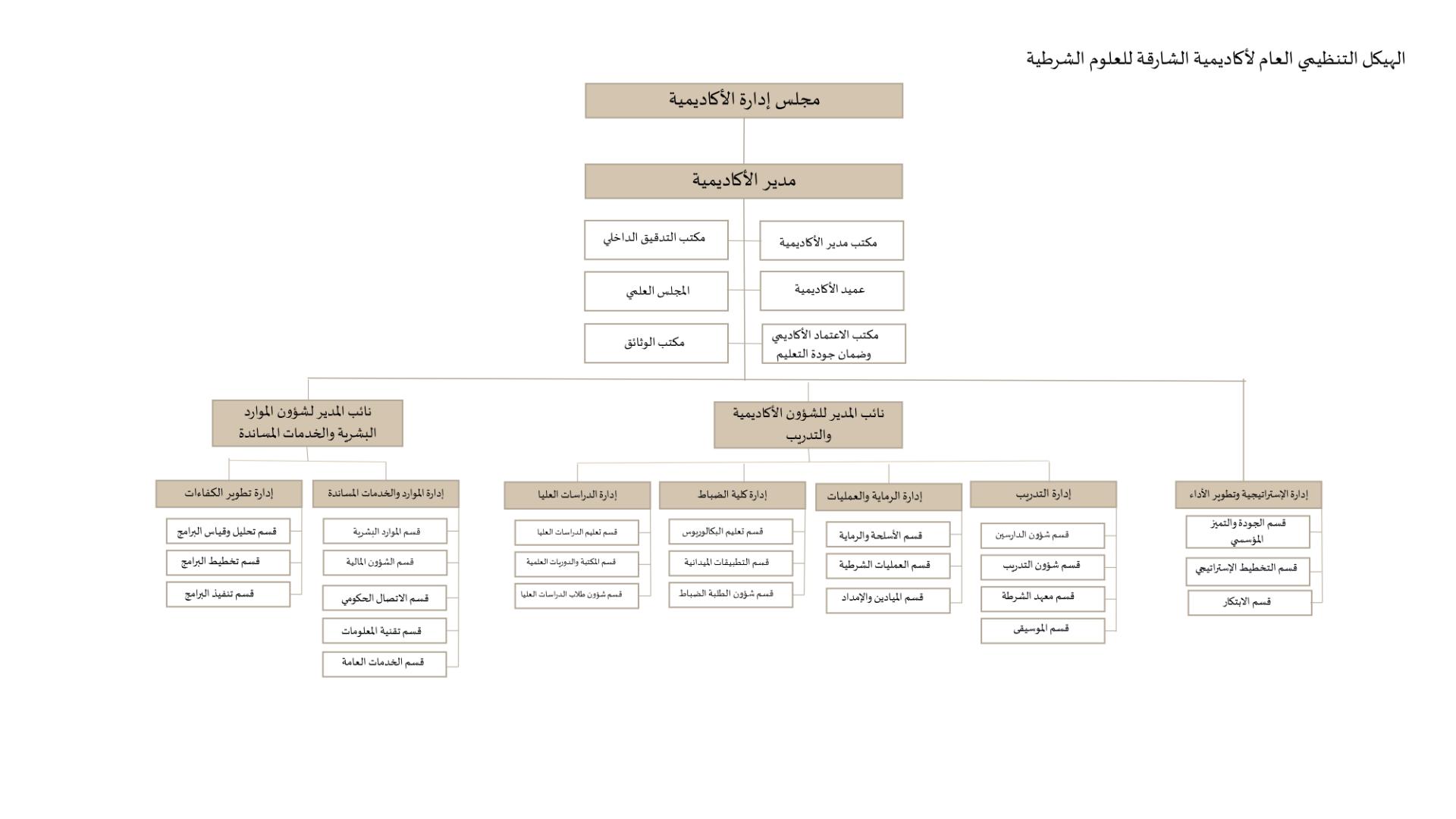 ونص المرسوم على أن يُعتمد الهيكل التنظيمي العام لأكاديمية الشارقة للعلوم الشرطية، ويُصدر المجلس التنفيذي بقراراتٍ منه الهيكل التنظيمي التفصيلي لأكاديمية الشارقة العلوم الشرطية، والقرارات اللازمة لتنفيذ هذا المرسوم بما في ذلك اعتماد التوصيف الوظيفي لمهام الوحدات التنظيمية للأكاديمية بما يتفق مع اختصاصاتها، واستحداث أو دمج أو إلغاء أي وحدات تنظيمية تتبع الإدارات المُدرجة ضمن الهيكل التنظيمي العام.