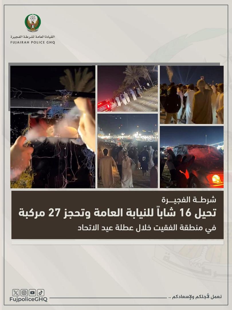 ضبطت القيادة العامة لشرطة الفجيرة عدداً من المتهورين خلال الفترة من 28 نوفمبر 2025 إلى 2 ديسمبر 2025، بعدما ارتكبوا مخالفات جسيمة تهدد السلامة العامة في منطقة الفقيت، وذلك تزامناً مع تكثيف الإجراءات الأمنية ورفع مستوى الرقابة الميدانية خلال احتفالات عيد الاتحاد لضمان بيئة آمنة لأفراد المجتمع. وبيّنت القيادة أنه تم إحالة 16 شاباً إلى النيابة العامة جراء قيامهم بسلوكيات متهورة عرّضت حياتهم وحياة مستخدمي الطريق للخطر، وذلك باستخدامهم أدوات الرش ومدافع المياه بطريقة غير أخلاقية، في إطار تطبيق القانون بكل حزم وردع أي ممارسات تخلّ بالنظام العام. وعلى الصعيد المروري، أوضحت الشرطة أنه تم حجز 27 مركبة ارتكب أصحابها مخالفات مرورية خطرة، فيما سجّلت الإمارة 270 حادثاً مرورياً خلال الفترة ذاتها، من بينها 269 حادثاً بسيطاً، مقابل حادث واحد نتجت عنه إصابات. وأكدت القيادة العامة لشرطة الفجيرة أن هذه النتائج تعكس الجهود الميدانية المكثفة التي تبذلها فرق الشرطة لحماية أفراد المجتمع، مشددةً على أهمية الالتزام بالقوانين المرورية والتحلي بالسلوك الحضاري، بما يضمن استمرار الاحتفالات الوطنية في أجواء آمنة تعبّر عن قيم الاتحاد وترسّخ مكانة الدولة في تعزيز الأمن والاستقرار