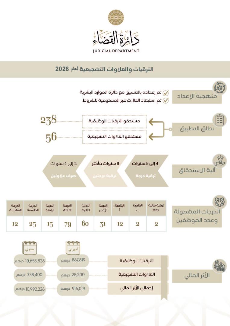 ترقيات لـ238 موظفاً، وعلاوات تشجيعية لـ56 موظفاً على الكادر الإداري بدائرة القضاء في حكومة الشارقة، بتكلفة إجمالية سنوية تبلغ 10 ملايين و992 ألف، و228 درهماً.