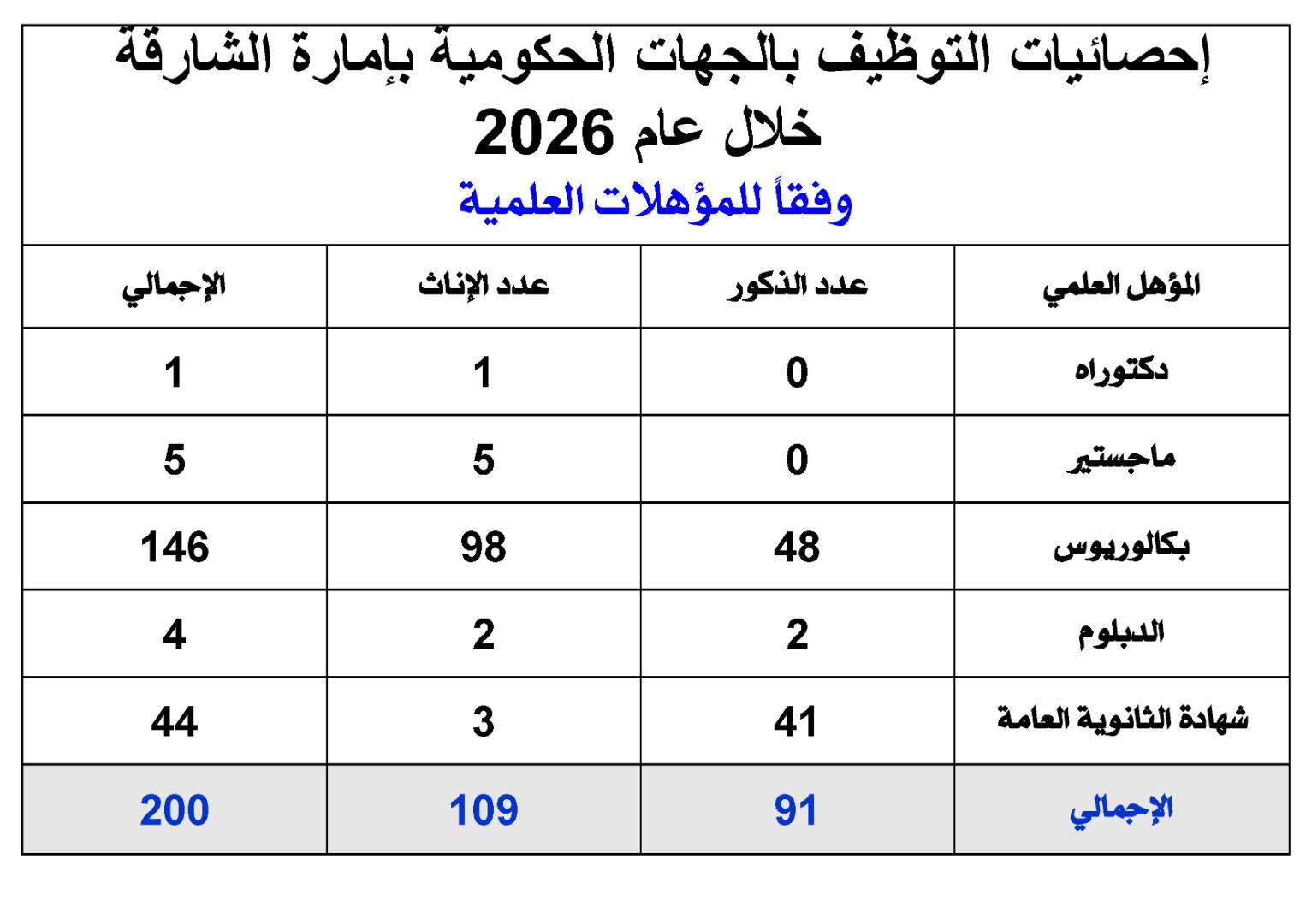 كل المؤهلات العلمية مشمولة في إحصائيات التوظيف بإمارة الشارقة