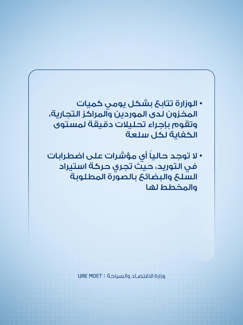 في ظلّ ما تشهده المنطقة حالياً من اضطرابات جيوسياسية، تؤكد وزارة الاقتصاد والسياحة أن السلع الغذائية الأساسية في الدولة متوفرة بكميات كافية في الأسواق