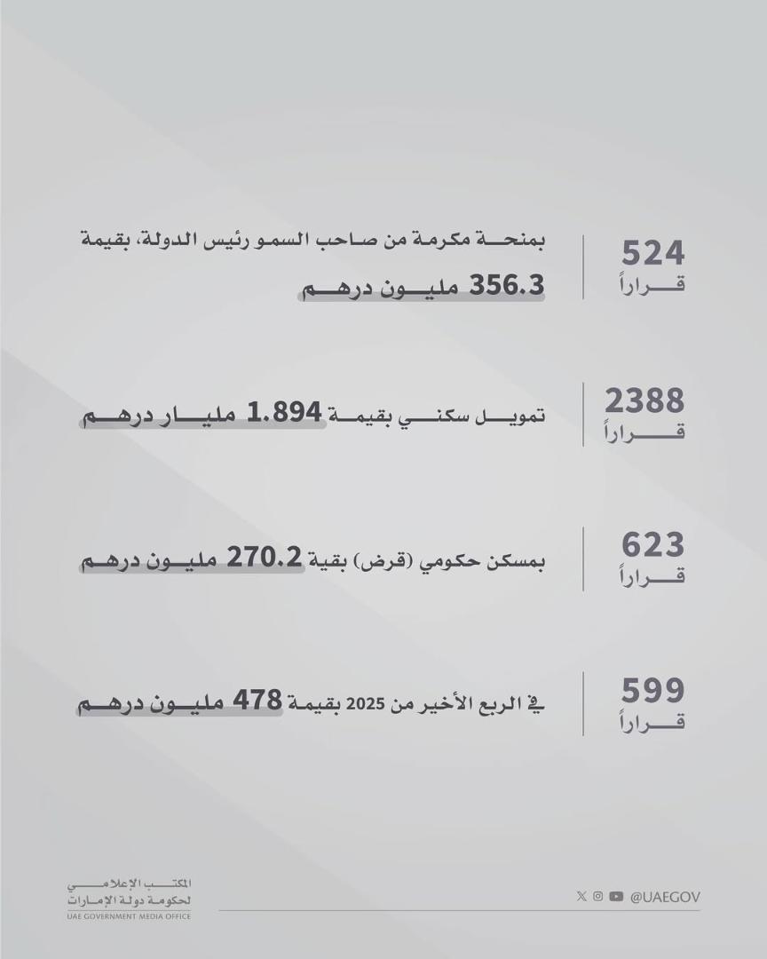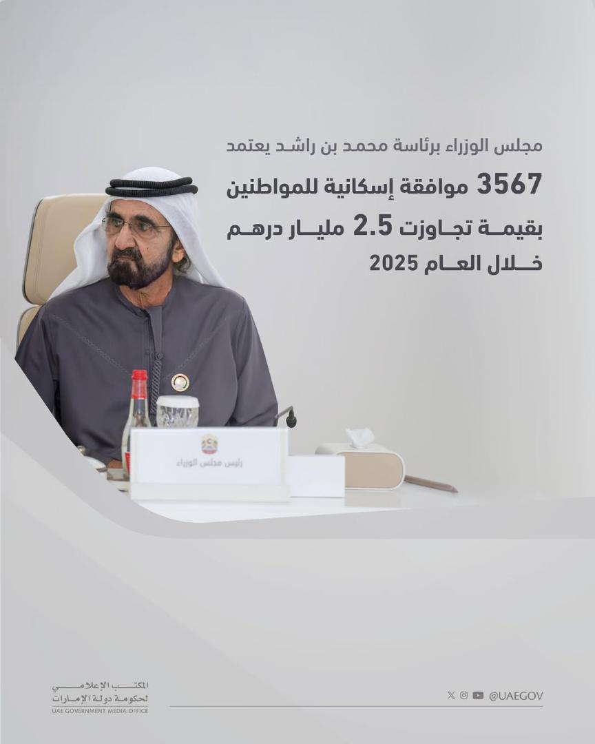 مجلس الوزراء برئاسة محمد بن راشد يعتمد 3567 موافقة إسكانية للمواطنين بقيمة تجاوزت 2.5 مليار درهم خلال العام 2025.