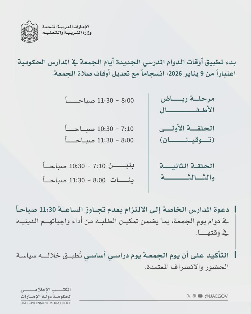 وزارة التربية والتعليم تعلن تحديث أوقات الدوام المدرسي أيام الجمعة في المدارس الحكومية